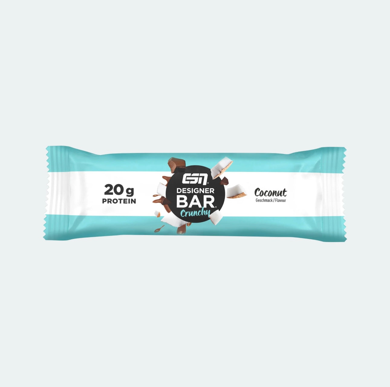 Protein meets crunch: Our Designer Bar Crunchy combines valuable proteins and irresistible chocolate flavor in one bar. You can enjoy and at the same time supply your muscles with up to 21 g of protein 1 .